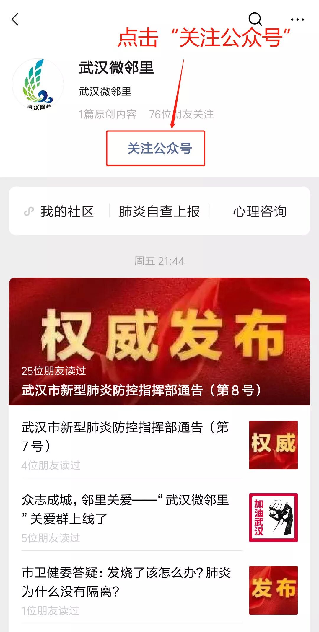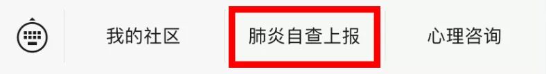 第一步:关注“武汉微邻里”微信公众号后,点击下方菜单栏中的“肺炎自查上报”。
